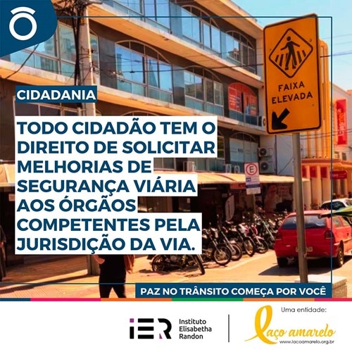 Além disso, de acordo com o artigo 72 do CTB, o Código de Trânsito Brasileiro, todo cidadão ou entidade civil tem o direito solicitar aos órgãos competentes pela jurisdição das vias melhorias no trânsito, por exemplo, em sinalização, fiscalização e implantação de equipamentos de segurança, além de sugerir alterações em normas e legislações do CTB.